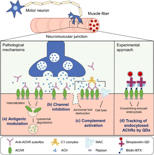 • Lee CW, Zhang H, Geng L et al (2014) Crosslinking-induced endocytosis of acetylcholine receptors by quantum dots. PLoS One 9(2):e90187. doi:10.1371/journal.pone.0090187 This study takes advantage of the unique features of QDs and the multivalency of biotin-streptavidin interaction to mimic the cross-linking-induced AChR endocytosis in MG pathogenesis.