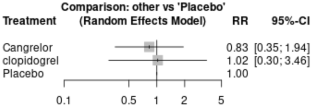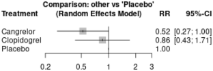 Cangrelor is a potent intravenous non-thienopyridine P2Y12 inhibitor. We conducted a network meta-analysis to study the efficacy and safety of cangrelor as compared with the oral P2Y12 inhibition, clopidogrel, or placebo in acute coronary syndromes.