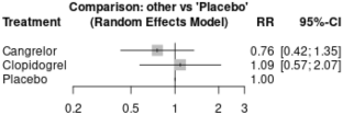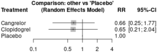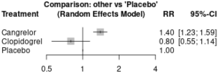 The analysis was comprised of 6 studies including 26,444 patients treated with cangrelor, clopidogrel, or placebo. There were no statistically significant differences in the incidence of all-cause mortality, myocardial infarction, stent thrombosis, target vessel revascularization, or major bleeding. Cangrelor was associated with a higher risk of minor bleeding than clopidogrel or placebo, with no difference in requiring blood transfusion.