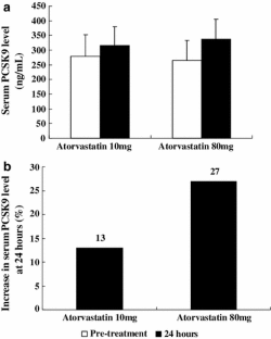 Atorvastatin 10 mg/day decreased low-density lipoprotein cholesterol (LDL-C) by 32 % at 4 weeks and by 33 % at 8 weeks, and atorvastatin 20 mg/day resulted in reduction of LDL-C by 41 % at 4 weeks and by 38 % at 8 weeks. Atorvastatin 10 mg/day slightly increased serum PCSK9 by 5–7 % but without a significant difference, while atorvastatin 20 mg/day significantly increased serum PCSK9 by 30 % at 4 weeks and by 35 % at 8 weeks (p = 0.009 and p = 0.002, respectively). In addition, 24 h after a single dose, atorvastatin 10 mg significantly increased serum PCSK9 by 13 % and atorvastatin 80 mg by 27 % (p = 0.042 and p = 0.001, respectively).