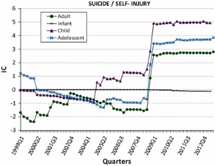 A total of 14,670 ICSRs for montelukast were recorded, of which 2630 corresponded to psychiatric disorders in people aged <18 years. The main symptoms reported for infants (aged <2 years) were sleep disorders, for children (aged 2–11 years) the main symptoms were depression/anxiety, and for adolescents (aged 12–17 years) they were suicidal behaviour and depression/anxiety. Suicidal behaviour was over-represented in all age groups with information component (IC) values that reached 5.01 in children and 3.85 in adolescents. Unexpectedly, completed suicides were reported more frequently for children (IC: 3.15; IC025: 1.98) than for adolescents (IC: 3.11; IC025: 2.61) or the total population (IC 1.95; IC025: 1.73).