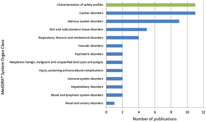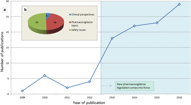 The publications were classified in: (1) ‘safety issues’ when they describe a safety signal, characterisation of a risk or characterisation of the general safety profile of the drug; (2) ‘pharmacovigilance topics’ when the data were used to analyse a pharmacovigilance activity, research methodologies (e.g. signal detections methodologies, pharmacovigilance in paediatric population) or ADR reporting patterns (e.g. consumer reports, medication errors); and (3) ‘clinical perspectives’ when the EV data were used to support clinical practice and treatment guidance discussions.