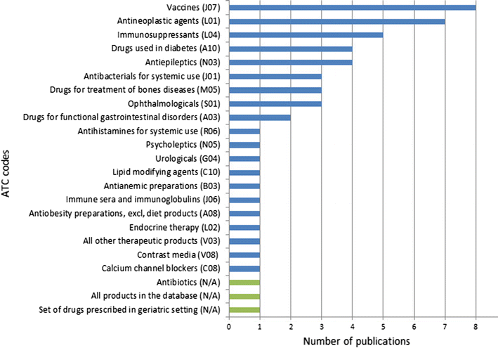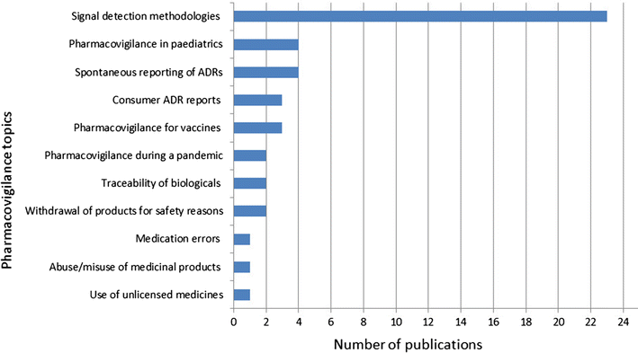 The 46 (44%) publications describing general pharmacovigilance topics contain research to analyse methodologies, especially on statistical signal detection, together with descriptions of specific situations that should to be taken into consideration when analysing safety data (e.g. paediatric population or ADR reports from consumers). The category related to signal detection methods includes publications under the scope of the IMI PROTECT project for which public funding was allocated [17, 18, 19].