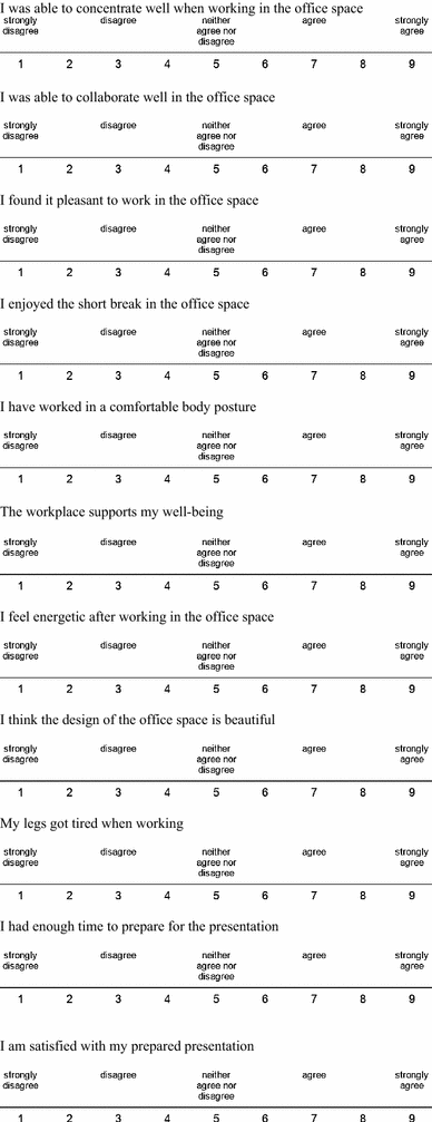 As mentioned in the Methods section, we measured participants’ experiences working in the two offices with a questionnaire using a 9-point Likert scale