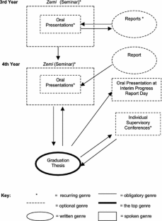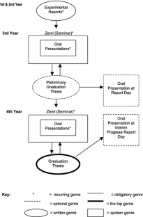 Genres observed in university settings are referred to as “academic genres” (Bhatia 1993) or “study genres” which are further categorized into written genres (e.g., essays, seminar papers, exams, theses) and spoken genres (e.g., seminars, lectures and consultation hours) (Mauranen 1994). Genres produced in the process of research in particular are also called “research genres” (Swales 2004): for example, research articles; dissertations/theses; thesis defenses; research group meetings (RGMs); colloquia or one-time public presentations; conference presentations; graduate seminars in which oral presentations were delivered; discussion sessions in plenary lectures and poster sessions at a conference (cf. Shalom 1993; Swales 2004; Weissberg 1993).