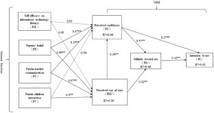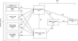 The purposes of this study were to explore the parents’ acceptance of participation in integration of technology into children’s instruction. The Technology Acceptance Model (TAM) was adopted as the framework in the study. There were 876 fifth-grader’s parents in Taipei, Taiwan participated in the study. The research results show that parents’ beliefs and parent–teacher communication can be used to directly and indirectly predict the perceived usefulness and perceived ease of use integration of information technology into instruction. The parents–child interactions can directly predict the perceived usefulness in TAM model and indirectly predict perceived ease of use. In the TAM model, the perceived ease of use and perceived usefulness could predict their attitude toward use and the intentions to use of the integration of technology into instruction for children. Finally, we discuss the implications of our findings for parents, teachers, and future studies.