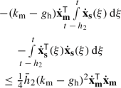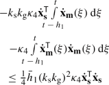 The integral terms \(\int _{0}^{t}{\dot{{\textbf{x}}}_{\textbf{m}}(\varepsilon )^{\textsf{T}}\rho _\textrm{m}(\varepsilon )}\,\textrm{d}\varepsilon \) and \(\int _{0}^{t}{\dot{{\textbf{x}}}_{\textbf{s}}(\varepsilon )^{\textsf{T}}\rho _\textrm{s}2(\varepsilon )}\,\textrm{d}\varepsilon \) are bounded since \(\mathbf {f_{\textrm{a}_\textrm{e}}},\mathbf {f_{\textrm{a}_\textrm{h}}}\in {\mathcal {L}}_2\) (Assumptions 2 and 3) and \(\dot{{\textbf{x}}}_{\textbf{m}},\dot{{\textbf{x}}}_{\textbf{s}}\in {\mathcal {L}}_\infty \).