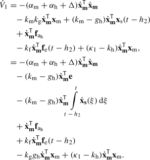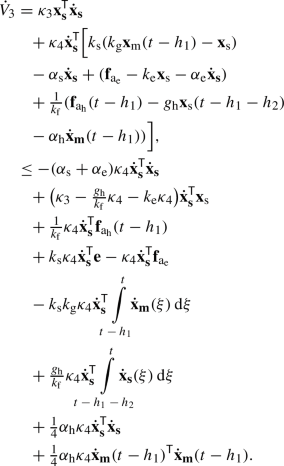From the functional \(V( \mathbf {x_\textrm{m}},\dot{{\textbf{x}}}_{\textbf{m}},k_\textrm{g}\mathbf {x_\textrm{m}}-\mathbf {x_\textrm{s}},\mathbf {x_\textrm{s}},\dot{{\textbf{x}}}_{\textbf{s}}) =V_1+V_2+V_3+V_4\) represented by (14), (15), (16) and (17), remembering that \({\textbf{e}}=k_\textrm{g}\mathbf {x_\textrm{m}}-\mathbf {x_\textrm{s}}\); its derivative along the system trajectories will be obtained.