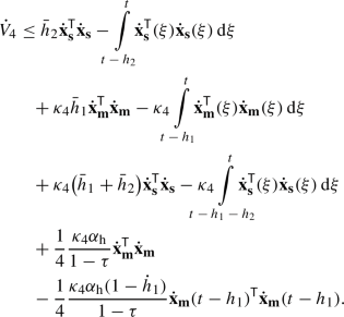 Stability analysis is hard to complete because there are terms with delayed variables in (A.2) and (A.5). To solve this, \(V_4\) (17) has been proposed, whose derivative considering Assumption 1 is obtained by: