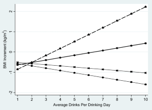 For all racial/ethnic groups except Mexican Americans, current drinkers had a lower mean BMI than non-drinkers. Mean BMI differences were − 0.721 kg/m2 for non-Hispanic white (white) men and − 1.292 kg/m2 for white women. Among drinkers, drinking frequency was negatively associated with BMI for all racial/ethnic groups; however, this effect was significantly smaller for Mexican American men and other Hispanic men than white men. Dosage was positively associated with BMI among all racial/ethnic groups except Mexican American women and other Hispanic women; this effect was significantly stronger among black women than white women.