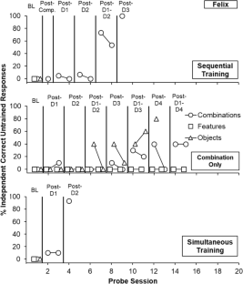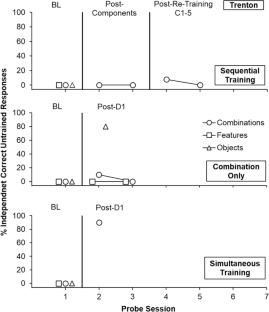 Recombinative generalization is the production of responses in the presence of novel combinations of known components. For example, after learning “red triangle” and “blue square,” recombinative generalization is observed when a child can tact “red square” and “blue triangle.” Recombinative generalization can emerge from a history of matrix training, which involves carefully selecting and arranging stimuli and responses along at least two axes and training a subset of responses. With three children with autism spectrum disorder, we compared recombinative generalization of object–action or feature–object tacts when the component stimuli were trained before combination stimuli, trained along with combination stimuli, or untrained (i.e., combination only). For two participants, training the components along with some combinations led to the most untrained targets acquired without direct teaching. For the other participant, training the combinations only led to the greatest proportion of untrained targets acquired without direct teaching. We discuss stimulus control promoted by each teaching arrangement and suggestions for future research on recombinative generalization.
