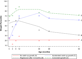 Ong KK, Ahmed ML, Emmett PM, Preece MA, Dunger DB (2000) Association between postnatal catch-up growth and obesity in childhood: prospective cohort study. BMJ 320(7240):967–971