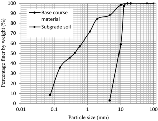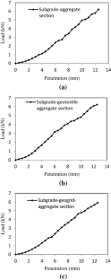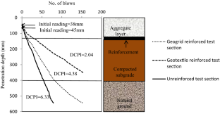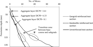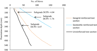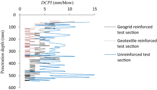 Dynamic cone penetrometer has been used widely as a pavement evaluation technique for many years. Unpaved roads constructed on weak soil subgrade are frequently subjected to severe damage and hence, they require regular maintenance and repair. One of the main stabilization methods of improvement of the serviceability of these roads is to reinforce them with geosynthetics (geotextile/geogrid). Field experiments were conducted on unpaved test sections reinforced with geotextile and geogrid, with the potential use of dynamic cone penetrometer (DCP) and digital static cone penetrometer (SCP) to assess benefits of geotextile and geogrid reinforcement. Laboratory California bearing ratio (CBR) tests were also conducted on subgrade–aggregate section and the effect of geosynthetic reinforcement was investigated by placing the reinforcement layer at the interface of the base course layer and weak subgrade. Digital SCP was used to measure the load–displacement behavior of geosynthetic-reinforced test section in the field. The field test results of DCP were expressed in terms of dynamic cone penetration index (DCPI, mm/blow), defined as the penetration depth of the cone per hammer blow and recorded along with the depth profile. A decrease in DCPI value was observed for the reinforced test sections as compared to the unreinforced test section. DCP results were able to detect transition zone and significant change in the strength of unpaved test section along with penetration depth. The field results indicate the greater resistance to penetration in the geosynthetic-reinforced test section and the penetrometer resistance increases with the depth. Higher penetration resistance offered by the geotextile has more contribution to the performance improvement of the test section.