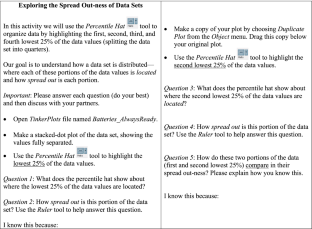 Six 7th-grade students engaged with an instructional sequence involving the use of the TinkerPlots software to organize data sets in ways intended to help them construe two attributes: the location of quarters of the data within a sub-range of the entire set, and the spread of those portions. We present evidence of students’ thinking about these attributes drawn from their responses to questions posed in the instructional sequence. Comparison of findings from a pre-test and a culminating task suggest that the students enriched their ability to imagine and create hypothetical data from a given representative box plot, and that they became oriented to the spread of portions of a data set as indicated by the length of its quarters.