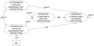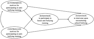 Bullying has become a pervasive threat for education, health, and policy. Inadequate professional development in bullying prevention and intervention has compounded this issue. Since teachers’ professional development is a critical aspect in shaping supportive, healthy, and safe learning environments as well as creating and maintaining high-quality education, the purpose of this study is to gain more insight into the motivational processes that contribute to teachers’ intention to participate in future anti-bullying professional development and intervene upon encountering school bullying. The study employed self-determination theory to examine associations between K-12 teachers’ (N = 414) autonomous (intrinsic and identified) and controlled (introjected and external) motivation for participating in anti-bullying training and their intention to (a) participate in future anti-bullying training and (b) intervene upon encountering school bullying. Structural equation modeling revealed that, unlike controlled motivation, teachers’ autonomous motivation for participating in anti-bullying training was positively related to their intention to participate in future training and intervene upon encountering school bullying, implying that school policy and professional development should foster autonomous motivation to increase intention to intervene upon encountering school bullying. Implications for professional development, educational practice, and future research are discussed.