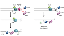 End resection is initiated when the MRE11 endonuclease nicks the 5′ strand of the DSB at a distance approximately 10 to 300 bases from the break end. Then, MRE11 digests the 5′ strand in the 3′ to 5′ direction (Garcia et al. 2011). MRE11 is part of the core of the MRN complex and interacts with itself, RAD50, NBS1, and the DNA substrate. In vitro biochemical studies have shown that MRE11 has three types of nuclease activity, namely ATP and Mn2+-dependent ssDNA endonuclease activity, dsDNA-dependent 3′–5′ exonuclease activity, and hairpin-opening activity (Paull and Gellert 1998; Haber 1998). The nuclease activities of MRE11 is critical for HR and cell survival. Genetic studies in both yeast and mammalian cells indicate that defects in the MRE11 nuclease activities result in severely aberrant HR phenotypes, such as recombination deficiency and hypersensitivity to ionizing radiation and chemotherapeutic drugs (Shibata et al. 2014a; Buis et al. 2008). The Mre11 nuclease-deficient homozygous allele in mice is embryonically lethal, similar to Mre11-null mice (Buis et al. 2008). However, for many years, it has been difficult to reconcile the polarity of the exonuclease activity of MRN with its known critical biological role in promoting the 5′ to 3′ resection of DSBs (Paull and Gellert 1998; Paull 2018). A major advance in unravelling this paradox was the observation that the processing of Spo11-induced breaks in Saccharomyces cerevisiae occurs through the endonucleolytic cleavage of the 5′ strand adjacent to the Spo11 covalent conjugate and subsequent 3′ to 5′ exonucleolytic degradation towards the conjugate (Paull 2018; Garcia et al. 2011) (Fig. 2). This endo-then-exo (bidirectional) end resection model explains the existence of the 3′ to 5′ exonuclease activity and suggests the existence of a protein block at the DSB end in HR (Garcia et al. 2011). Subsequent biochemical studies have confirmed the protein block-induced endonuclease activity of MRE11, and such protein block also displayed some inhibitory effect on the degradation of the 3′ strand by MRE11 (Cannavo and Cejka 2014; Anand et al. 2016, 2019; Cannavo et al. 2019). Furthermore, other studies have shown that this endonuclease activity is regulated by phosphorylated CtIP (or Sae2, the yeast Saccharomyces cerevisiae homolog of CtIP) and that CtIP itself is specifically modified by cell-cycle dependent kinase (CDK) in the S and G2 phases of the cell cycle (Huertas et al. 2008; Sartori et al. 2007; Cannavo and Cejka 2014; Anand et al. 2016). These findings not only demonstrate the existence of the protein-block-induced endonuclease activity of MRE11, but also suggest a mechanism for the coordination of HR with cell cycle progression, by regulating the initiation of DNA end resection or the endonuclease activity of MRE11 (G. Ira et al. 2004). Studies using endo- and exo-nuclease-specific inhibitors of MRE11 have also indicated that the MRE11 endonuclease activity determines the initiation of DNA end resection, thereby enabling MRE11 exonuclease activity and HR (Shibata et al. 2014b). During meiosis, Spo11, a member of the topoisomerase II family, is responsible for generating DSBs in chromatin and inducing meiotic recombination (Lam and Keeney 2014; Keeney 2001). However, unlike traditional type II topoisomerases, which break DNA by transiently forming a phosphodiester bond with the 5′ end and then re-ligating the ends immediately after topological changes, the Spo11 enzyme does not rejoin the two ends but instead covalently conjugates to the 5′ strand to form a protein-blockage, as shown in Fig. 1 (Keeney 2001). Although Spo11-blockage is sufficient to induce DNA end resection and HR in meiosis, it is only one way in which HR can be initiated, as the expression of Spo11 is limited to meiosis phase I and the Spo11-like blocking protein has not been found in mitotic cells (also see Box 1) (Keeney 2001; Paull 2018). HR commonly occurs in mitotic cells and is induced by certain cellular processes, such as endonuclease-mediated mating-type switches in yeast (Jasin and Rothstein 2013; Mehta and Haber 2014). Recent studies suggest that the NHEJ protein complex Ku70/80, as well as the DNA-dependent protein kinase catalytic subunit (DNA-PKcs), might play a role as a protein-block to induce the endonuclease activity of MRE11 (Langerak et al. 2011; Teixeira-Silva et al. 2017; Deshpande et al. 2020) (Fig. 2). This model appears to be excellent since Ku70/80 is highly abundant in cells and efficiently binds DSBs to promote NHEJ (Lieber 2010; Mimori and Hardin 1986). The endonuclease activity of MRE11 removes Ku70/80 from DSBs and facilitates the repair pathway to HR over NHEJ. However, there is some controversy surrounding this model, since genetic evidence from both yeast and mammalian cells indicates that Ku70/80-deficient cells exhibit defects in end-joining but HR is otherwise enhanced (Allen et al. 2002; Li et al. 2018; Langerak et al. 2011). Furthermore, the deletion of pku70 or pku80 (homologs of human Ku70 and Ku80, respectively) in Schizosaccharomyces pombe does not show any increased sensitivity to ionizing radiation or other DNA damaging agents like that exhibited by the HR factors (Manolis et al. 2001; Langerak et al. 2011). Therefore, further experimental evidence supporting this hypothesis is required to determine whether Ku70/80 or DNA-PK act as an end-blocking factor. Certainly, more studies are needed to more clearly understand how DNA end resection is initiated and how the MRN complex nuclease activity is regulated.