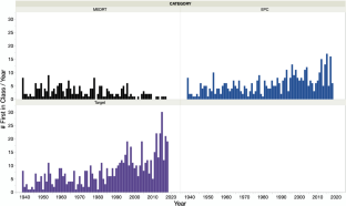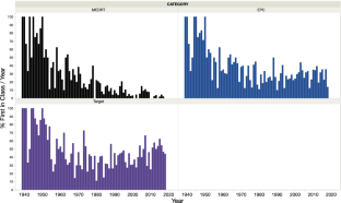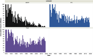 The average annual score based on therapeutic class novelty has been declining; however, the therapeutic class total innovation score has been stable since the mid-1970s with occasional significant peaks of activity. While the average score based on mechanism or target experienced a decline beginning in the 1950s and 1960s, it has begun to rise since the early 1990s. Notably, the total innovation score has steadily increased since the 1970s. These variations closely parallel the number of first-in-class drugs approved on an annual basis.