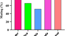 C. maculatus and C. chinensis were mass reared on mung bean under laboratory conditions at 27 ± 1 °C temperature with a 65 ± 5% (RH) in the insect growth chamber (IGC) at Banda University of Agriculture and Technology, Banda during 2024. The pure culture of C. maculatus and C. chinensis were obtained from Indian Council of Agricultural Research (ICAR)—Indian Institute of Pulses Research (IIPR), Kanpur. After adult emergence from the infested seeds, male and female adults of both sexes were kept in a polypropylene storage box (250 ml) for mating and allowed for egg laying on freshly harvested seeds of mung bean. Mung bean seeds with freshly laid eggs of C. maculatus and C. chinensis were introduced in 1.5 ml tubes to develop virgin adults for further experimentation. The healthy 50 g seed was kept in plastic tubes (10 × 5 cm) and five pairs (five males and five females) of the newly emerged pulse beetle were released. They were allowed to remain in the grains for mating and oviposition and the beetles were removed from the container five days after the release when they laid the eggs.
