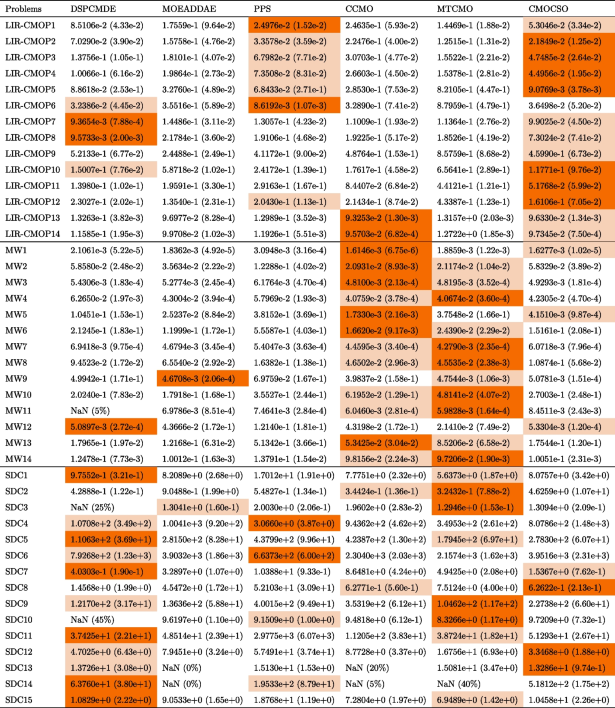 Table 4 The average IGD(std) value obtained through different algorithms. The best and second best average IGD of all algorithms in each test function are highlighted in dark orange and light orange, respectively