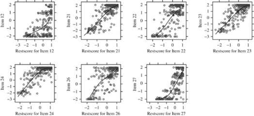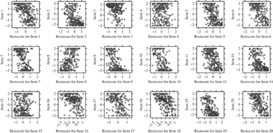 The first approach looks at internal association by fitting a locally adjusted regression curve on scatter plots between each item and a scale consisting of all other items (Dinas and Gemenis, 2010; Gemenis and Dinas, 2010). I follow this approach because a central assumption of the Likert scale is that, every item in the scale is monotonically related to the underlying latent dimension (Jacoby, 1991, p. 40). This implies that the scores of an item that fit well into a scale should increase as the scores in the latent dimension increase and vice versa. In this case, the scores in the latent dimension are proxied by the values of the scale consisting of all other items. Nevertheless, because item-rest correlations measure linear relationships, while we are merely interested in monotonic relationships, I evaluate monotone homogeneity by using locally adjusted regression (loess) curves instead of item-rest correlations.