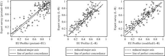 Unfortunately, many VAA websites do not give precise details regarding which items are included in each scale. The EU Profiler is no exception as the detailed ‘General Description and Methodology’ document does not look at scale construction, although I was able to obtain the relevant information by contacting a member of the EU Profiler team. By using the provided information, I was able to fully replicate parties’ scores on the EU scale, that is, the scores given in the EU Profiler data set (Trechsel, 2010), but I was unable to do so for the L–R scale. As party scores in my reconstruction of the L–R scale correlate highly with the scores in the original data set (0.961), save a single outlier and no bias is detected, I proceed into analysis with this small caveat in mind.