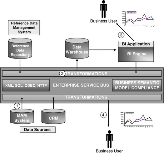 The transformation step takes disparate data structures and definitions and converts them (using business understanding) to a standard format. This standard format is based on the common semantic model, which we discussed earlier. Within a service-orientated architecture, the transformation layer will be able to perform the same transformations on individual transactions as it will to bulk files, and software tools, which extract, transform and load data into warehouse environments (commonly referred to as ETL tools), can be set up to use the same logic for both transactional and batch sets of records. The transforms will all be based on the common semantic model.