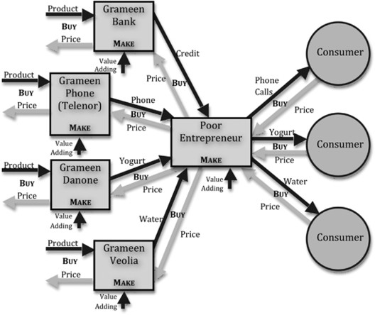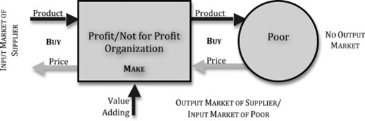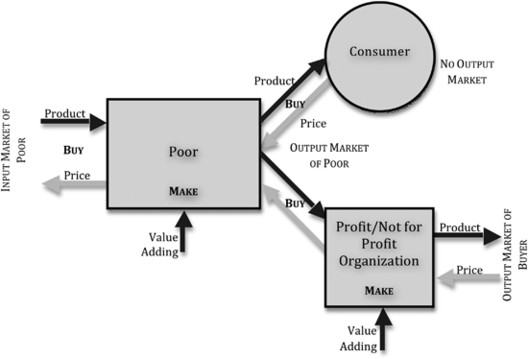 In order to make and sell products to buyers in output market transactions, the poor buy products in input market transactions. The capabilities that the poor lack will have to be bought from suppliers in their input markets. One essential capability that the poor need to buy is credit and social businesses with financial, as well as social objectives are required to provide them. In addition, the poor lack the capability to develop the strategies required to serve their buyers and will have to buy the consulting services for their entrepreneurial ventures from suppliers. The credit and consulting services may be bundled together or provided separately by specialist organizations for different segments of the poor. Partnerships among social and commercial businesses may emerge to make the products bought by the poor to make the products for their buyers. Over time these value-adding chains will evolve to resemble those that serve the non-poor. Alleviation by providing the credit and consulting services in input markets to make the products for buyers in output markets enables the poor to lift themselves out of poverty.