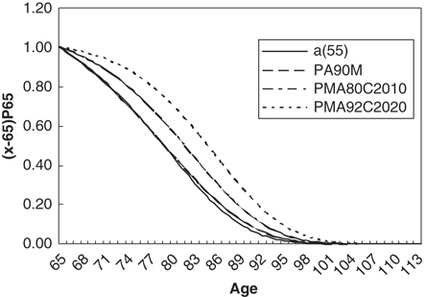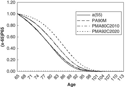 The a(55), PA90M, PMA80C2010 and PMA92C2020 mortality tables, which relate to annuity and pension businesses, are constructed differently. The a(55) table, constructed in 1955, is the oldest mortality estimation (CMIB, 1978); the PA90M table uses data from 1967 to 1970; and PMA80C2010 uses data from 1979 to 1982 (CMIB, 1988, 1990) and projects mortality rates for the calendar year 2010 from the PMA80 tables. Finally, PMA92C2020 is the most recent, based on data from 1991 to 1994 (CMIB, 1998, 1999) and projects mortality rates for the calendar year 2020 from the PMA92 tables.