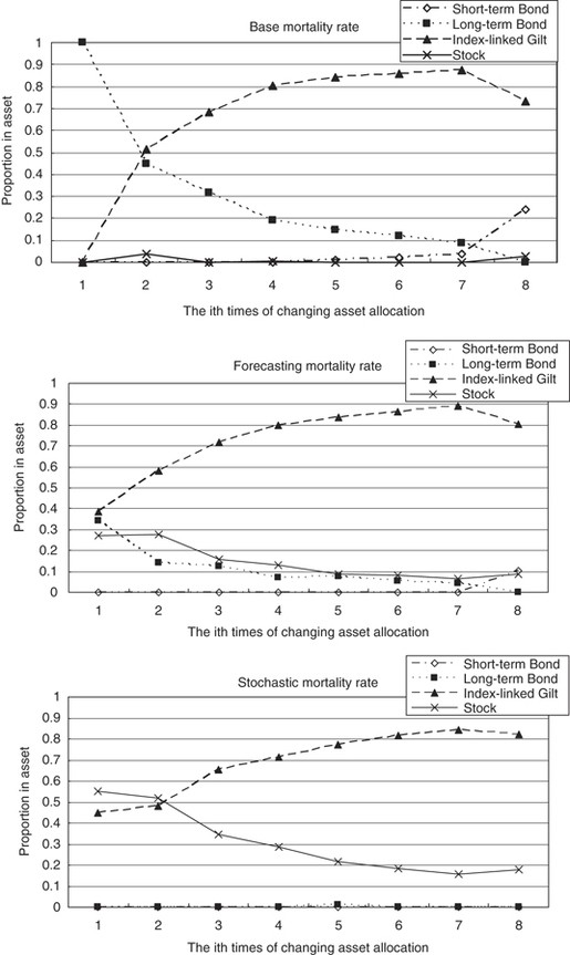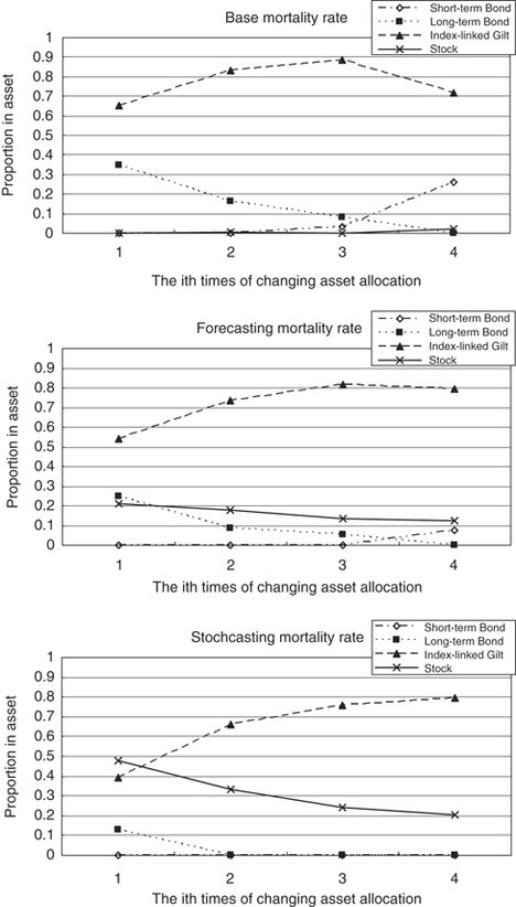 Investment strategies for a pension fund involve a long period. We cannot ignore the inflation risk. In addition to long-term bonds, short-term bonds and stocks – the traditional elements of a pension fund portfolio – we consider index-linked gilt.34 Thus, we consider four assets in the investment strategy for pension funds. To examine the impacts of longevity risk in the U.K. pension market, we employ Wilkie's35 investment model to project the dynamics of future asset returns and the salary growth rate. The advantage of Wilkie's model is that it uses a range of financial indicators, including retail price inflation, share dividend yields, bond yields, long-term bonds and short-term bonds. In addition, it projects the dynamic of salary growth. The parameters of Wilkie's investment model have been estimated using U.K. financial data. The financial econometrics of Wilkie's investment model appear in Appendix. Blake et al.36 examine a range of asset-return models to assess the model risk for a DC pension fund including Wilkie's investment model. In this research, we attempt to study the impact of longevity risk on the optimal asset allocation. Thus, we illustrate our numerical example using only Wilkie's investment model. The question of model risk is not addressed in this research.