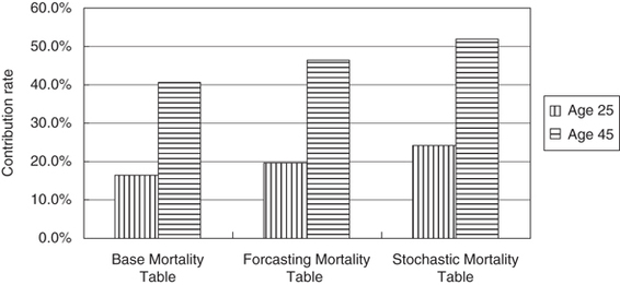 In assessing the performance of different investment strategies, if we change the rebalancing proportions more frequently, the person in general holds more long-term bonds at the beginning of the accumulation period to gain higher returns. When employees approach retirement, they switch and hold more short-term bonds to reduce their liquidity risk. The optimal contribution rate is not very sensitive to the investment strategy but tracking error is.57 To meet the 80 per cent income RR of the pension fund target, the optimal contribution rates for investment strategies 1–4 are 16.55 per cent, 16.58 per cent, 16.37 per cent and 16.37 per cent, respectively but the tracking error changes significantly over the four strategies, from 360.55 to 384.45 to 404.23 and finally to 421.24 for investment strategy 4. Therefore, more frequent changes to the rebalancing proportion can improve target liability matching.