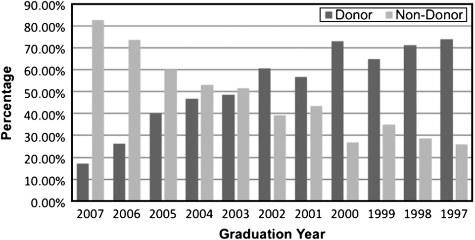 Those respondents who indicated that they had a good experience while attending this university were more likely to be donors. Another way of saying it may be that these alumni were generally satisfied with their university experience. Although this survey did not test separate measures of satisfaction with one's university, Clotfelter (2003) described ‘satisfaction with one's undergraduate experience is a mark of approval that would be expected to induce feelings of gratitude or a desire to enhance the institution's chances of future good influences’ (p. 114). Clotfelter's study on alumni giving and one conducted by Monks (2003) found similar results that satisfaction with the university experience leads to higher giving levels as an alumnus.