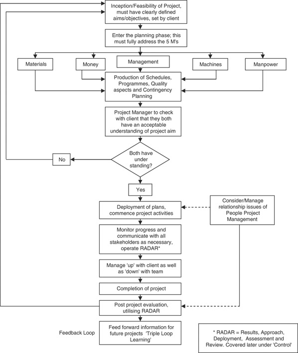 The critical starting point in Figure 1 is the establishment of the project's aims and objectives, or what are the expected deliverables as determined by the project brief, as agreed by all stakeholders, as previously noted, this will determine the extent of a projects success. Figure 1 also notes the use of the RADAR Concept as a driving and controlling force.