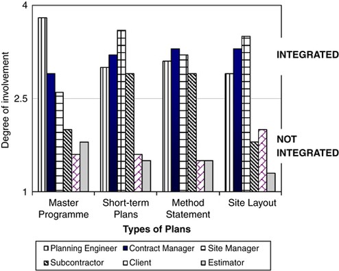 The degree of integration of the key participants in planning is determined by measuring the level of involvement of the key participations in the production of four project plans. The key participants and the four project plans were identified from the semi-structured interviews. The key participants are the Planning Engineer, Contract Manager, Site Manager, Estimator, Subcontractors and Clients. The four types of project plans are the Master Programme, Short-Term Plans, Method Statement and Site Layout.