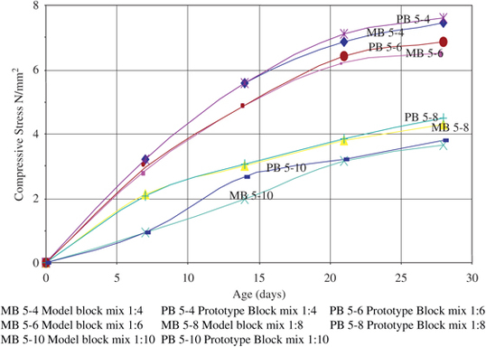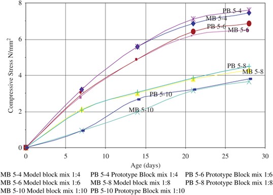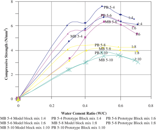 The compressive strength of sandcrete masonry block units in model and prototype rose with the increase in the water–cement ratio, attaining a maximum value at an optimum value of about 0.5 for all mixes tested. The maximum value at 28 days constituted 3.8, 4.47, 6.85 and 7.60 N/mm2 for prototype 1:10, 1:8, 1:6 and 1:4 blocks, respectively. The corresponding values for the model blocks were 3.65, 4.3, 6.50 and 7.46 N/mm2. The predicted values of strength as a function of the water–cement ratio are in close agreement with those of the prototype blocks.