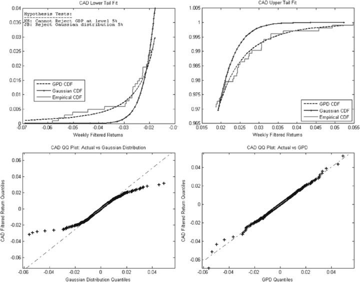 Going back to Figure 2, we can see in the upper plots that the Pareto distribution (GPD) closely converges to the observed data in the tails, and hence is more reliable in extrapolating beyond an empirical distribution when compared with the normal distribution. The lower right plot shows that the quintiles of the empirical distribution of CAD weekly excess return residuals and generalized Pareto distribution quintiles match quite closely as we do not observe any consistent deviations from the straight line anymore, unlike the case with a normal distribution in the lower left plot. Finally, a Kolmogorov–Smirnov goodness-of-fit test confirms that the two distributions are statistically indistinguishable at level 5 per cent.