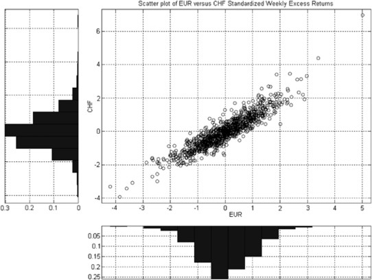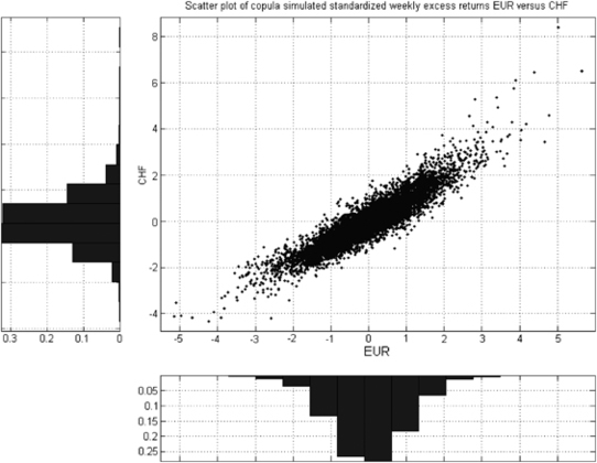 Standardized weekly excess returns of EUR versus CHF using GARCH conditional volatilities.Note: Scatter plot of the t-copula simulated GJR-GARCH(1, 1) standardized weekly excess returns of the EUR CHF pair.Source: Quantitative Investment Group (Period from 3 January 1990 through 12 August 2009).