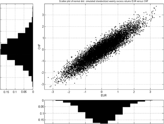 Standardized weekly excess returns of EUR versus CHF using bivariate normal distribution simulation with a covariance matrix.Note: Scatter plot of the simulated GJR-GARCH(1, 1) standardized weekly excess returns of the EUR CHF pair under bivariate normal distribution assumption.Source: Quantitative Investment Group (Period from 3 January 1990 through 12 August 2009).