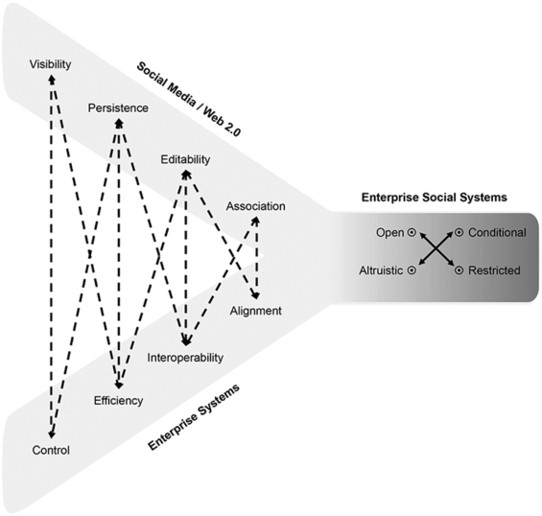 Although prior literature has largely focused on explaining the nearly unbound potential of ESS for today’s companies, little is known about the actual compatibility of the underlying principles of enterprise and social software – respectively organization-wide vs inter-organizational and interpersonal ways of sharing information. Is it really possible to unite both world views? Are users in business contexts ready for a change of mind? In fact, evidence exists that the implementation and adaptation of both paradigms into a common system is not a trivial task (Li et al., 2009). Wang et al. (2011) note that ‘the two systems [ES and ESS] have rather different natures […] ERP and enterprise 2.0 systems are incompatible.’
