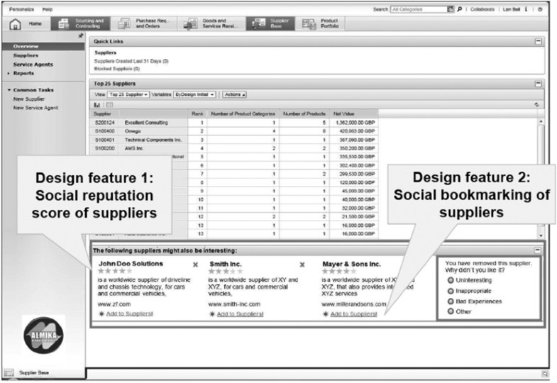 More specifically, this example shows the integration of two design features that are widely used in social media and e-commerce websites: Instead of relying on the company’s own experiences with a supplier, the implementation of a social reputation score, as used, for example, on eBay, Klout, PeerIndex and the like, allows a purchasing manager to rate and see how other companies perceive a supplier’s performance. By means of an additional social bookmarking or tagging feature, the purchasing manager may add, annotate, and share additional information about a supplier, which can be helpful for other companies to better comprehend why a particular rating decision was made.