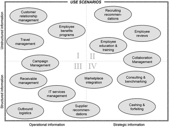 Without doubt, ESS open up many new opportunities for companies to share and make use of information within and across their own boundaries. As we will describe in the next sections, the application of social features by Internet-enabled ESS, such as social bookmarking and rating of suppliers, establishes many improvements compared with traditional, not socially enhanced ES. However, the previously discussed tensions may influence a business user’s willingness of information sharing, the kind of information that is shared, and expectancy of the returns from information sharing.