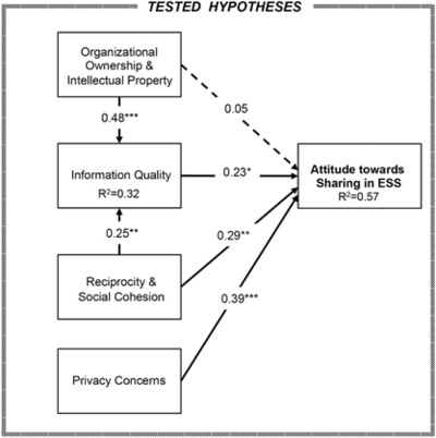 In what follows, the next section reviews prior studies on the affordances of and tensions between social technologies and traditional ES. Recognizing the importance of information sharing for ESS to function properly, we then develop and test a set of hypotheses about business users’ motivations and doubts for voluntarily and openly sharing information with others on interconnected and interpersonal ESS. Based on the evidence we obtained from our design experiments, we then discuss the practical and theoretical implications of information sharing in ESS settings. We end with the description of limitations of the study and some considerations of possible future research directions.