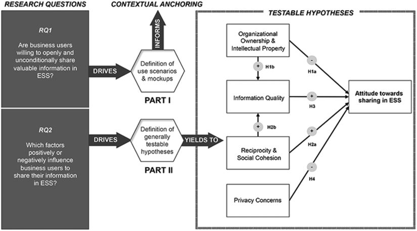 Following this thread, it is the aim of this paper to enhance our understanding of the compatibility of the ‘social paradigm,’ which appears to be nearly uncontested by the extant literature on ESS. More precisely, we want to investigate the key phenomenon of information sharing in the ESS context by addressing the following research questions: (1) Are business users willing to openly and unconditionally share valuable business information in ESS? (2) Which factors positively or negatively influence business users to share their information in ESS?
