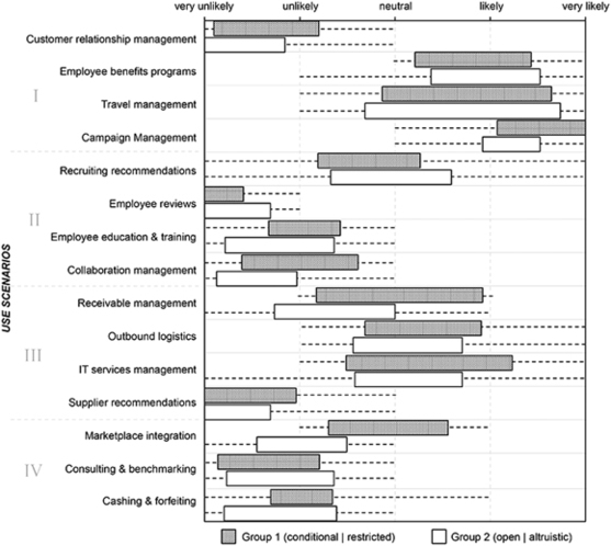 Based on random assignment, one group of users (47.6%) was provided with design mockups and descriptions that implied a self-motivational, hedonic, or altruistic realization of the use scenarios – that is, a setting in which information is openly shared without any rewards. The second group of users (52.4%) received the same design mockups, but the use scenario descriptions differed in that any information sharing was strictly anonymous and, to some extent, rewarded with monetary or nonmonetary incentives. After each mockup, the participants were asked via pop-up window whether they wanted to adopt such a use scenario or not. We used a 5-point Likert scale anchored with ‘1=very likely’ and ‘5=very unlikely’ for this rating.