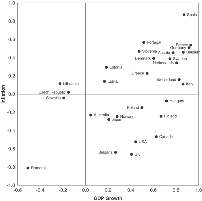 A few studies attempt to test whether the correlation of business cycles has changed over time. Babetski et al. (2002) use a Kalman filter to estimate time-varying correlation coefficients for supply and demand shocks in the acceding countries vis-à-vis shocks in the EU and Germany. They find that the correlation of demand shocks has increased during the 1990s, whereas correlation of the supply shocks has not increased to the same degree. Korhonen (2003) estimates correlation of impulse functions from two-variable VARs for two separate sub-periods (1992–1995 and 1996–2000) and finds that the correlation of business cycles increased clearly in the second half of the 1990s in the Czech Republic, Hungary, and Slovenia. These results suggest that increasing integration of the EU acceding countries with the EU has increased business cycle correlation and may continue to do so in the future.