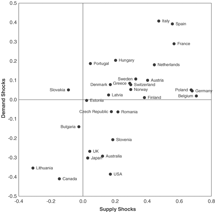 We recover the supply and demand shocks from two-variable (output and inflation) vector autoregressive (VAR) models with the help of the decomposition developed by Blanchard and Quah (1989). Different shocks are identified from the VAR residuals with the help of a restriction that demand shocks cannot have a permanent effect on output. The same procedure has been used before to assess whether the current European monetary union constitutes an optimum currency area, by e.g. Bayoumi and Eichengreen (1993).