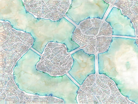 Emily Garfield’s maps of imaginary cities are snapshots of urban organisms, conflating the probable with the impossible, the living with the built, as they model and subvert analogies that tie urban space to microbiological life. Here, too, scale is rendered relative, circular even, as the bird’s-eye view afforded to an airplane traveling at cruising altitude becomes indistinguishable from the microscopic lens that reveals the innermost secrets of biological cells. The islands and waterways in Cityspace #179 express their external connectivity through bridges, proximity, and even the small piers that appear to reach out to nearby shores. But when viewed as cells and arteries, the islands and basins in this work articulate a deep sense of structural connectivity by virtue of inhabiting and sustaining a larger organism. In other words, Garfield’s irreverent flaunting of scale allows us to see the connectivity of islands in the sea.