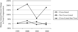 Since Nasdaq/Amex firms are smaller than the non-cross-listed firms (data not shown), but their compensation is similar to that of the non-cross-listed firms, this suggests that it is not just firm size that is responsible for the differences between the cross-listed and non-cross-listed firms.