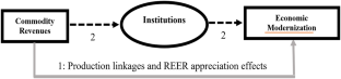 We embed the distributional bargaining concept in Sir Arthur Lewis’s labor surplus economy setting. In the petroleum-abundant labor surplus economies, distributional bargaining comes into its own, mainly over the subsidization of the large swaths of the population working in the sectors with substantial amounts of disguised unemployment. These are primarily the subsistence agriculture and the public sector. Based on the open-loop noncooperative differential game model, we derive three feasible bargaining equilibria, whereby only the antagonistic and the allocation modes are compatible with the setting of inferior institutional quality that dominates most natural-resource-dependent countries. We scrutinize both modes in the framework of the dual economy model and show that political bargaining in the allocation mode unambiguously protracts the process of economic modernization. The outcome of the antagonistic mode for the process of structural change depends on the magnitude of the labor cost increase in this phase. To assess the bargaining–modernization nexus empirically, we employ mostly pooled mean group (PMG) estimators for panel datasets spanning the years 1990–2016 for 21 oil-producing countries. For the system generalized method of moments (GMM) panel estimations, we employ a panel with 82 countries. We find that the revenues generated from exports of natural resources have a positive long-run impact on the economic modernization. Consistent with our theoretical model, the interaction of the authoritarian regime type with the natural resource wealth has a robust negative impact on the indicators of economic modernization.