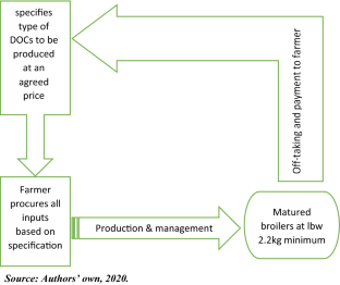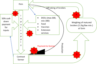 Contract farming raises the issue of principal and agent where both the principal and the agent are risk-averse, self-seeking and have minimal rational thinking. As a principal, the organisation aims to prevent the risks and costs of the internal production and contracts farmers for rearing and supplying live broiler or broiler chicken meat. It is easier to manage the contract with an agent when the contract contains incentives to motivate the agent to work in the interest of the principal. Such benefits can be public (legal redress), private (contract terms) or a combination of both (Prowse 2012). The sides keep working together as long as there is enough opportunity for both sides to move on. From the principal-agent theory, there is a likelihood of conflict between principal and agent, which needs to be well managed to ensure contract farming success within the poultry sector.