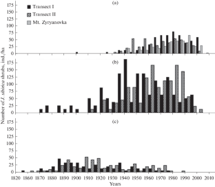 Surso, M.V. and Barzut, O.S., Specific features of growth and development of conifers in Bolshezemelskaya tundra: Juniper in the Pym-Va-Shor landmark site, Lesnoi Vestnik, 2010, no. 6, pp. 18–21.